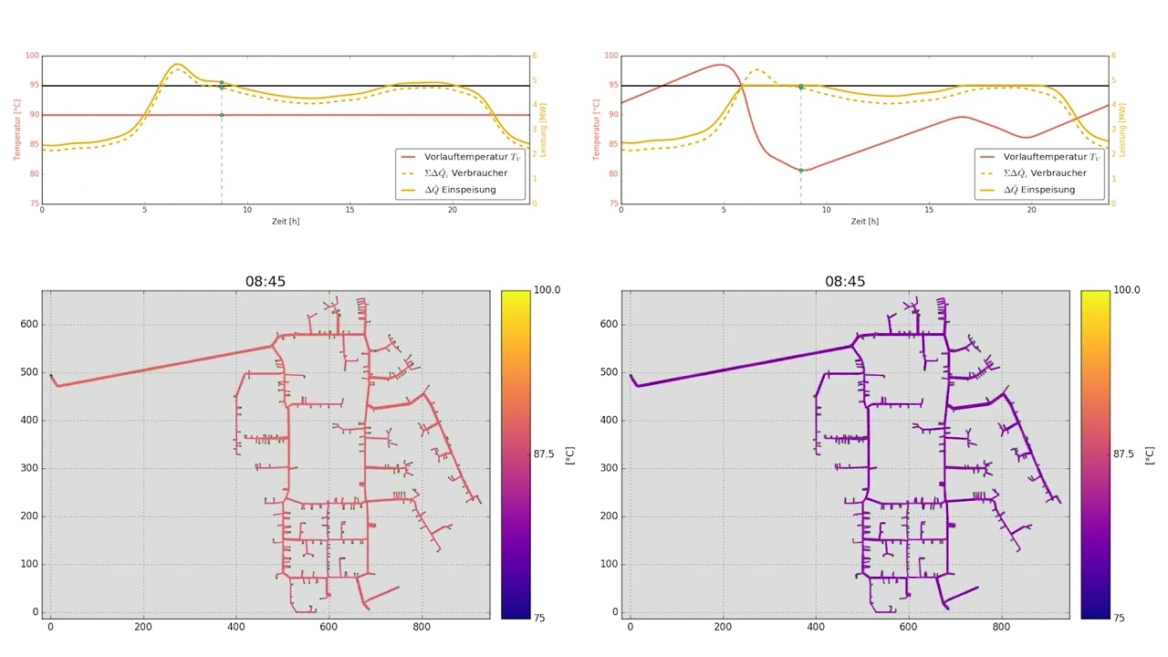 The dynamic simulation of the district heating network has enormous advantages: The network operator can use the software to monitor both the temperature and the flow conditions at any point in the district heating network at any time. This allows to control the feed temperature provided at the power plant and the mass flow pumped into the network and thus prevents, for example, gas boilers from having to be switched on at high cost to produce heat.
